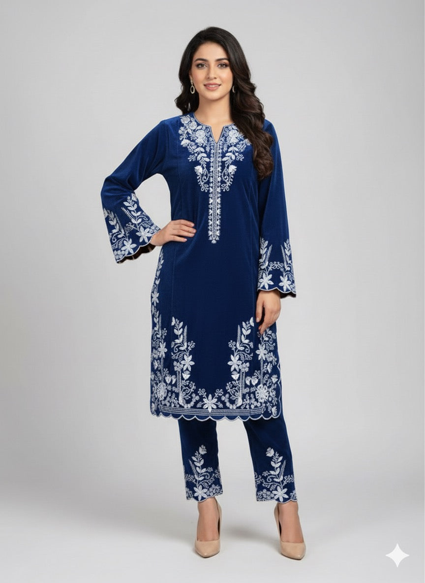 Elevate your festive and formal wardrobe with this royal velvet 2-piece suit, adorned with intricate golden embroidery. Designed for elegance and sophistication, this outfit is perfect for weddings, festive dinners, and evening gatherings where you want to leave a lasting impression.