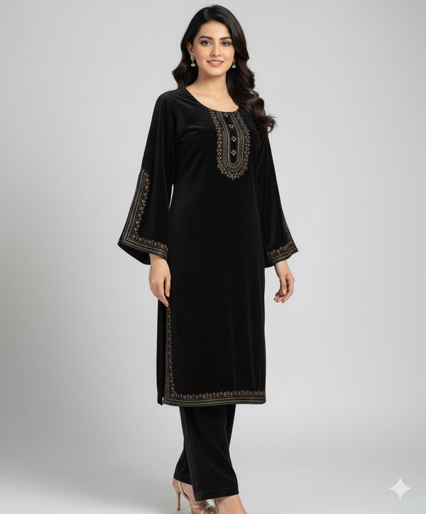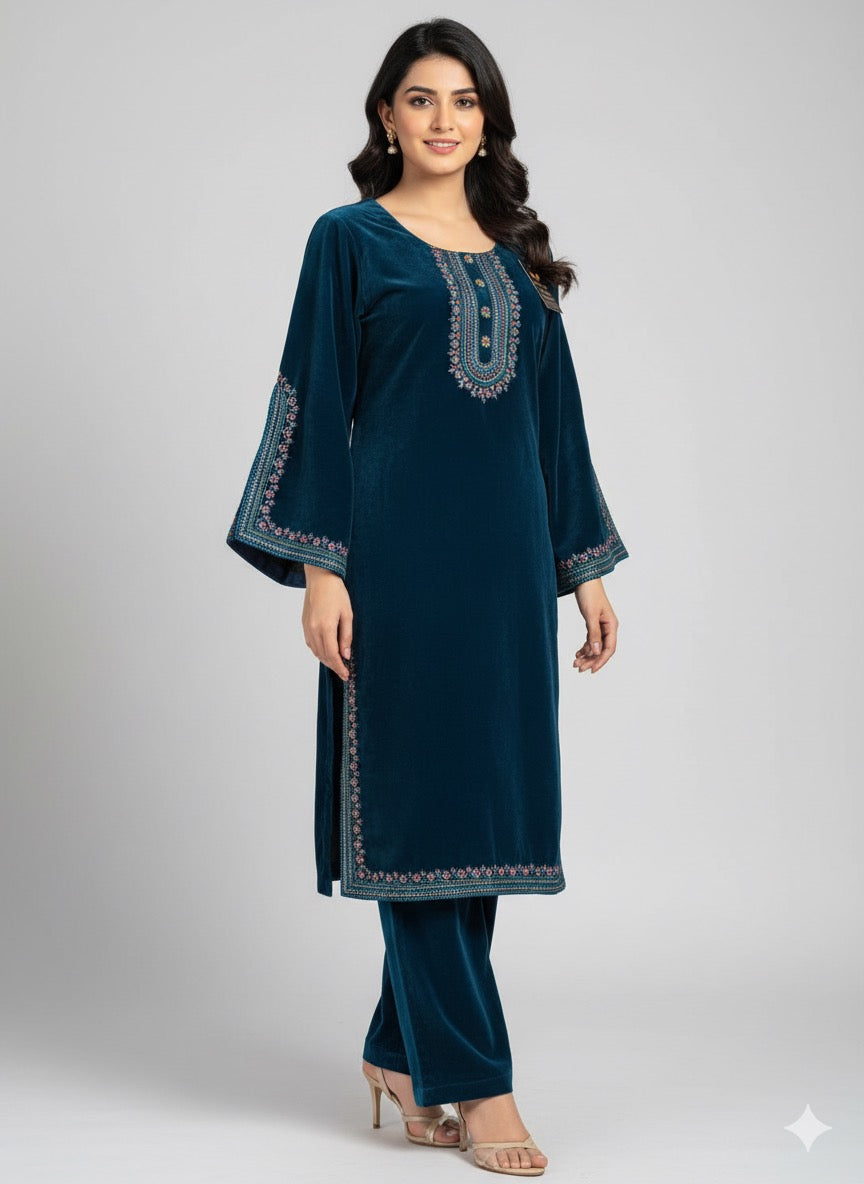 Elevate your festive and formal wardrobe with this velvet 2-piece suit, adorned with intricate golden embroidery. Designed for elegance and sophistication, this outfit is perfect for weddings, festive dinners, and evening gatherings where you want to leave a lasting impression.