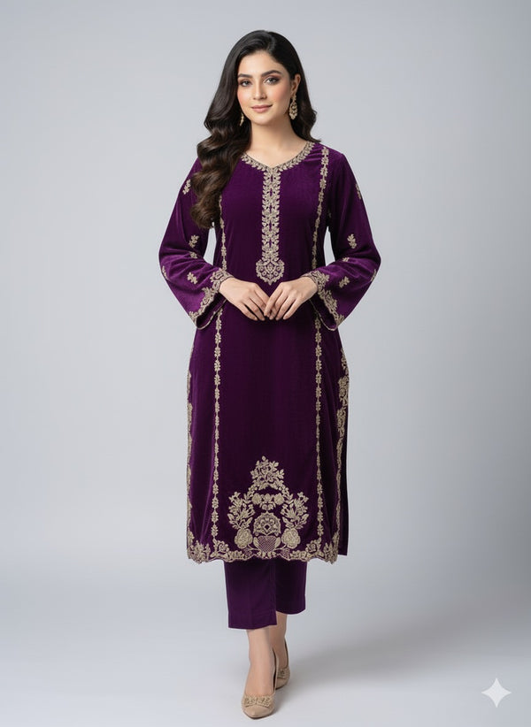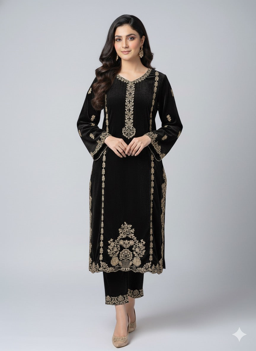 Elevate your festive and formal wardrobe with this velvet 2-piece suit, adorned with intricate golden embroidery. Designed for elegance and sophistication, this outfit is perfect for weddings, festive dinners, and evening gatherings where you want to leave a lasting impression.