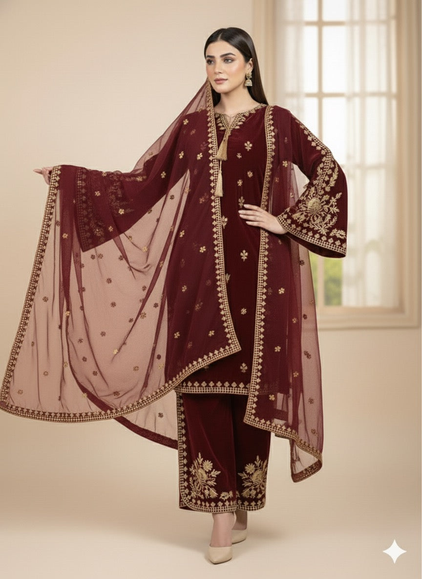 Fabric: Premium Quality Velvet for the Kameez and Trousers; Chiffon for the Dupatta.