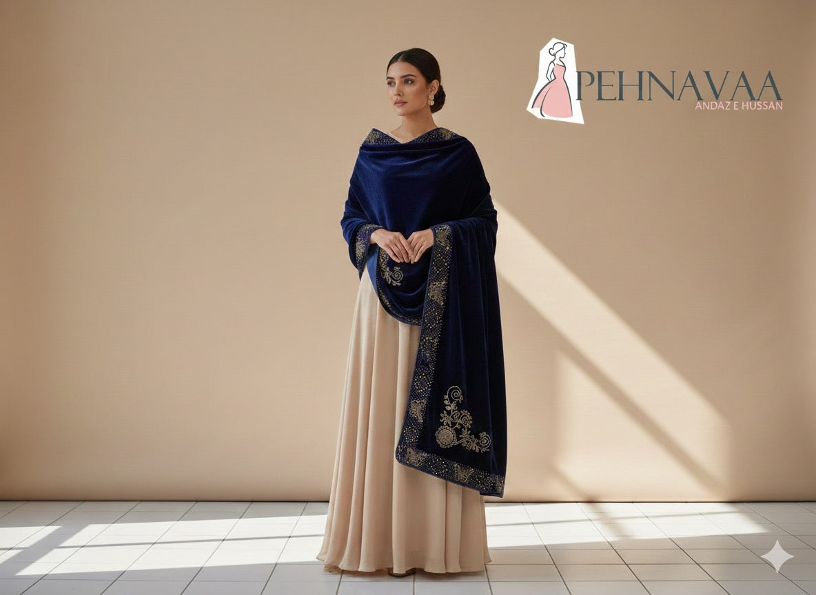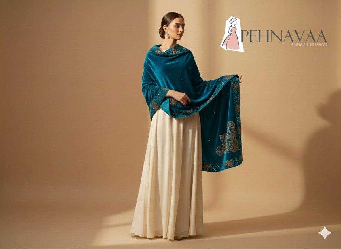 Indulge in the timeless charm of our VELVET SHAWL COLLECTION, crafted especially for women who appreciate elegance, comfort, and royal detailing. Each shawl is made from ultra-soft, high-quality velvet that drapes beautifully and adds an instant luxurious touch to any outfit. The rich texture, paired with intricate golden stone embellishments, creates a perfect fusion of tradition and modern sophistication.