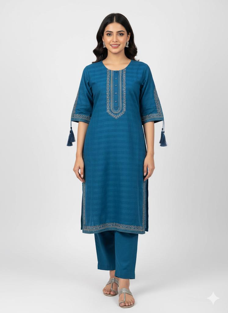 The deep teal blue shirt features subtle self-striped texture adorned with delicate thread embroidery along the neckline, sleeves, and hemline — adding a graceful charm to its minimalist design. The three-quarter sleeves are finished with embroidered borders and tassel detailing, giving the outfit a chic and contemporary touch.